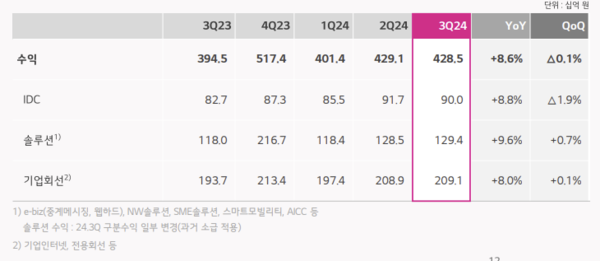 한편 LG유플러스는 3분기에 연결기준 매출 3조8013억원, 영업이익 2460억원을 기록했다. 전년 동기 대비 매출은 6.2% 늘었지만 영업이익은 3.2% 줄었다. 기업인프라 외에 전통의 캐시카우(현금창출원)인 모바일(무선 및 알뜰폰) 부문과 스마트홈·전화 부문에서 각각 전년 동기 대비 성장하면서 매출이 증가했다.