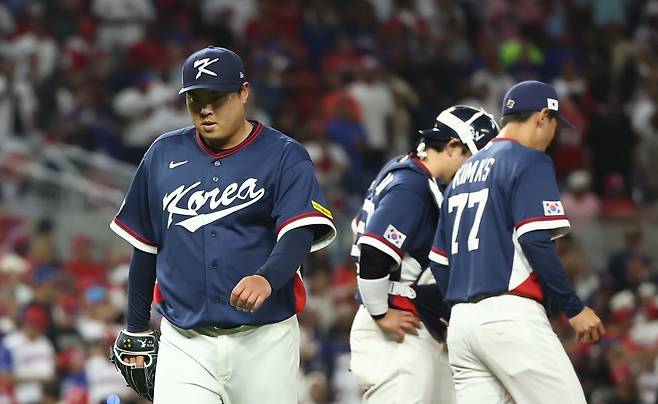 | ▲ 13일(현지시간) 미국 플로리다주 마이애미 론디포파크에서 열린 월드베이스볼클래식(WBC) 대한민국 대 도미니카공화국 준준결승전. 2회말 2사 1, 2루 한국 선발투수 류현진이 교체되고 있다. |