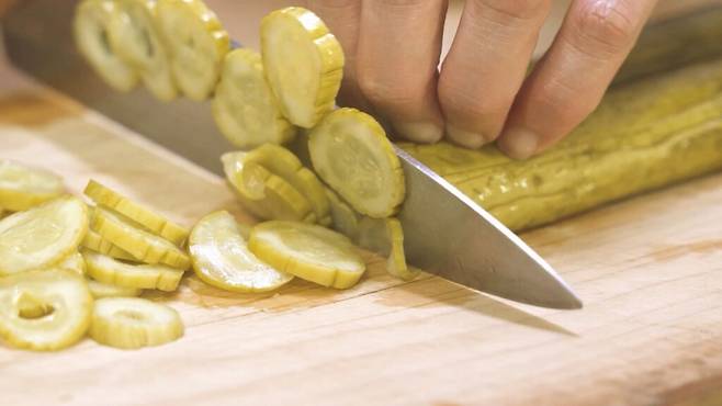 썰은 오이지를 한 번 헹군 뒤, 물에 20분 정도 담가 짠기를 빼줍니다.