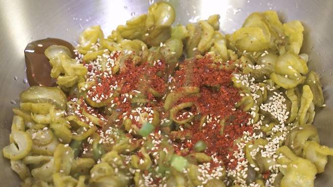 오이지무침 양념이 오이지에 촉촉하게 배어들면서 아작한 식감과 조화로운 단짠단짠 맛을 완성합니다.