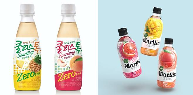 유산균 음료 쿨피스도 탄산을 넣은 제로 음료 쿨피스톡으로 출시됐어요. 매운 떡볶이 단짝이기도 한 쿨피스를 제로로 즐길 수 있다니 얼마나 좋은가요. 파인애플맛, 복숭아맛 두 가지 맛 모두 있습니다. 웅진에서는 아예 과채주스를 제로로 만들었습니다. 잘 말린 과일을 추출해 저온으로 담아냈다고 해서 이름은 ‘자연은 더말린’으로 지었어요. 무설탕 제로칼로리로 비타민C와 유산균이 들어있습니다. 자몽, 복숭아, 애플망고 세 가지 맛이 있어요.