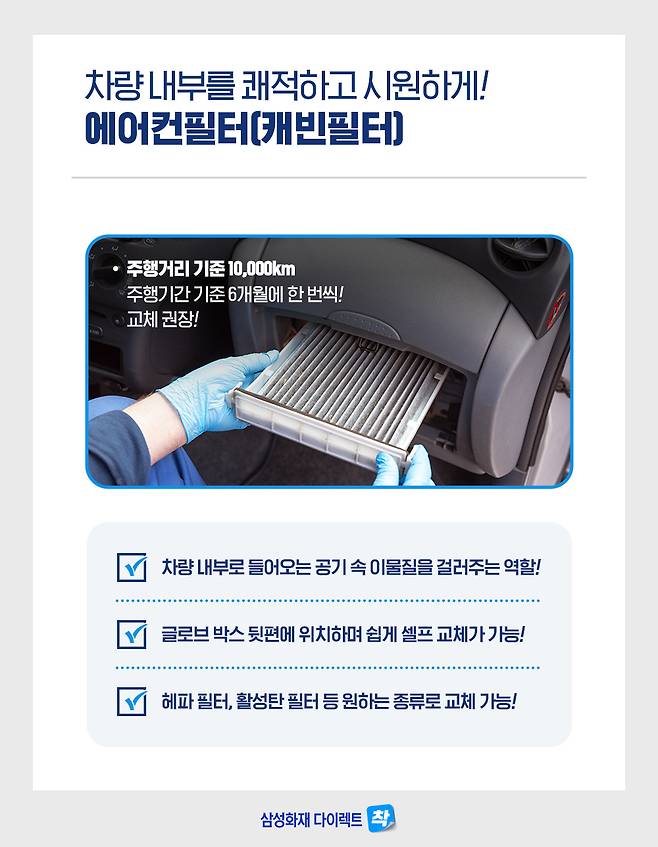 차량 내부로 들어오는 공기 속 이물질을 걸러주는 역할을 하는 만큼, 차량 내부의 컨디션에 영향을 주니 점검을 안했다면 꼭 확인해보세요!