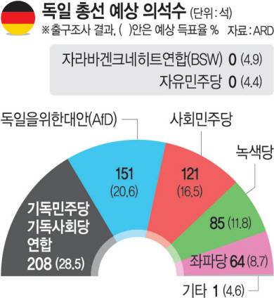 다만 단독 과반에 실패한 기독민주당·기독사회당 연합이 적어도 2개 정당과 연정을 꾸려야 해, 연정 구성까지 상당한 난항이 예상된다. 메르츠 대표는 AfD를 연정 파트너에서 제외했고, 사회민주당 또는 녹색당과 좌우 대연정이 가능하다고 밝힌 상태다. 하지만 기독민주당·기독사회당 연합은 녹색당과 기후·난민 등 대부분 쟁점에서 엇갈린다.