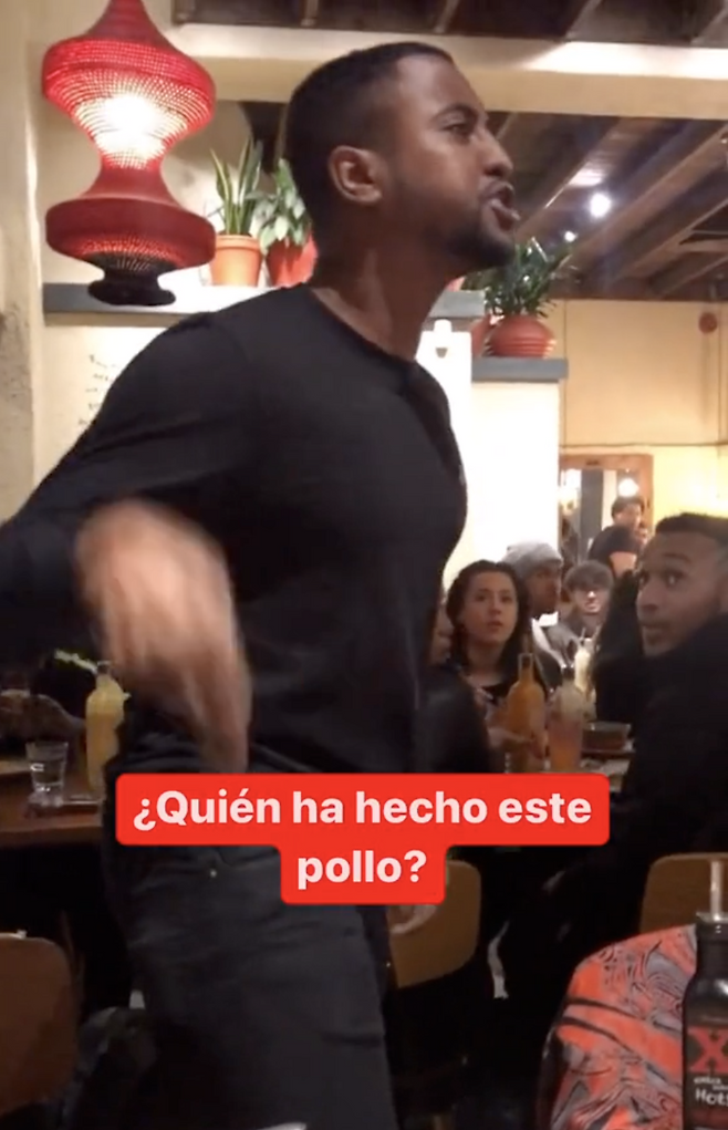 단순히 외치는 게 아니라, 음식을 손으로 여러 번 가리키는
