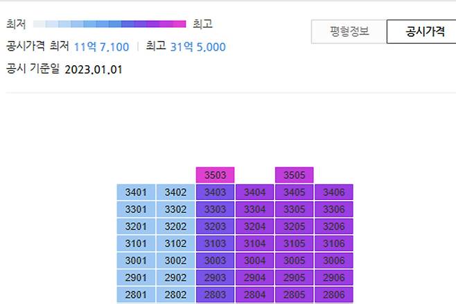 일례로 네이버 부동산을 통해 원하는 매물을 검색하면 한 아파트 내에서 동호수와 이에 따른 공시가격을 확인할 수 있다. 이어 해당 플랫폼의 경우 공시가격을 최저 수준부터 최고 수준까지 색깔별로 나눠 표기하기 때문에 색에 따른 공시지가 확인이 가능하다.