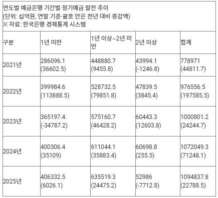 반면 지난해 1년 미만 정기예금 잔액은 406조3천325억원으로 6조원 가량 증가했고, 1년 이상∼2년 미만은 635조5천193억원으로 24조4천752억원 늘었다.