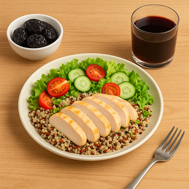 훈제 닭가슴살 슬라이스는 지방이 적고 단백질이 풍부해 노년층 근육 손실 예방에도 효과적인 단백질 보충원이다. 퀴노아 샐러드는 곡물류 중에서도 영양 균형이 뛰어나고, 프룬주스는 변비 예방과 장 건강에 좋아 아침 한 끼로 딱 좋은 조합이다.