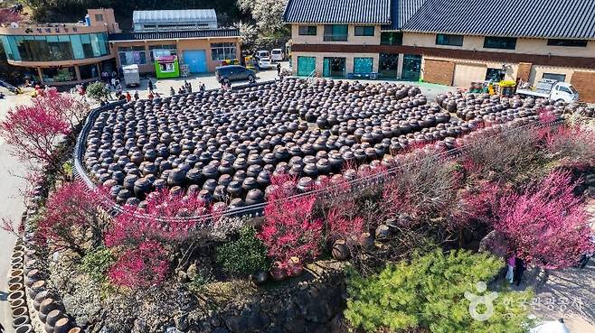 마을 위쪽으로 조금만 걸음을 옮기면 수천 개의 장독대가 줄지어 선 장관을 만날 수 있습니다. 매화꽃 아래 옹기종기 모인 장독대들은 우리네 삶의 깊은 맛과 멋을 담고 있는 듯해 마음이 참 편안해집니다.