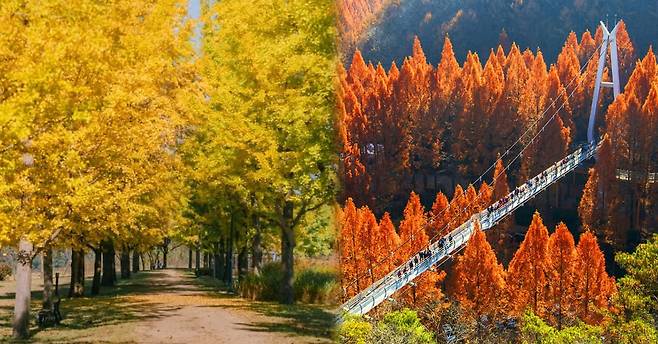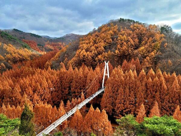 대전 장태산 자연휴양림은 최근 SNS를 통해 화려한 단풍이 절경을 이루는 것으로 유명한 국내 가을 여행지입니다. 높이 38m에 이르는 울창한 메타세콰이어 숲에 붉은 단풍이 들면 동화에서나 볼법한 숲의 풍경이 펼쳐지죠. 휴양림 내 6,700여 그루의 나무가 식재되어 있어 산책을 즐기는 내내 단풍에 파묻힌 듯한 느낌을 줍니다.