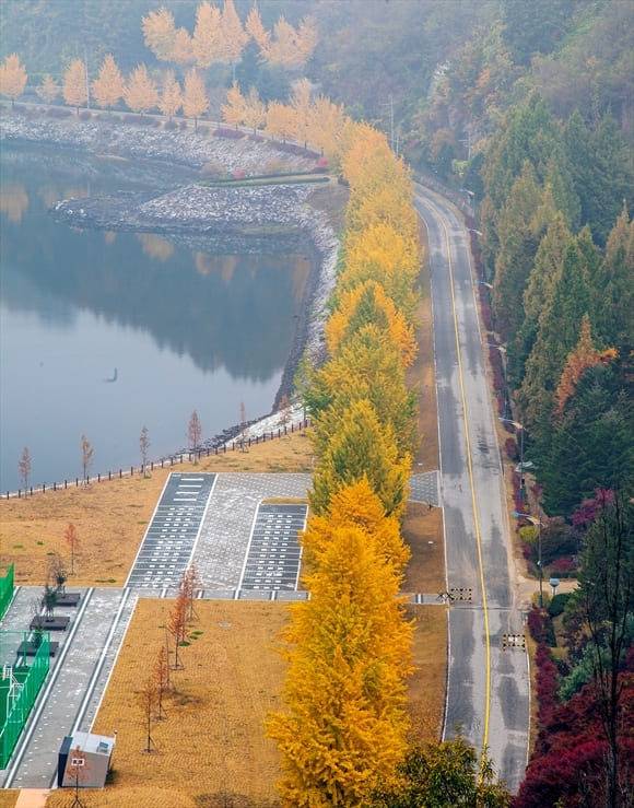 눈 닿는 모든 곳에서 가을 분위기가 풍겨오는 안동의 월영교입니다. 황금빛으로 흩날리는 은행나무가 강을 따라 심어져있어 황금빛 가을 산책을 즐기기 좋은데요. 약 387m 길이의 월영교의 끝에는 고즈넉한 한옥 정자 '월영정'이 있어 유유히 흐르는 강물 소리와 함께 단풍 산책을 즐기기 좋습니다.
