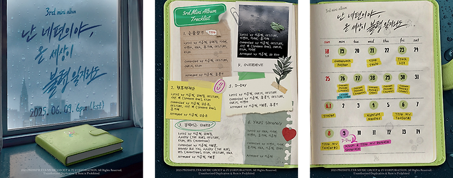 컴백 소식과 함께 처음 공개된 컴백 포스터에는 주인공 멤버 시연의 상징색인 초록색 다이어리📒가 비에 젖은 모습으로 등장합니다. 이후 공개된 두 장의 사진(타임 테이블, 트랙 리스트)을 이으면 다이어리의 속지가 완성되는데요. 내부 속지에도 빗방울 번짐 효과를 더해 이번 앨범이 ‘슬픔’과 관련된 메시지를 담고 있음을 간접적으로 드러냅니다. 추가로, 손글씨처럼 쓰여진 폰트, 사진 스크랩, 형광펜 밑줄, 하트 모양 스티커 등 곳곳에 '다꾸' 컨셉을 위한 장치들도 눈에 띄네요! 뮤직 비디오에서도 다이어리가 등장하는 것을 보아, 다이어리는 이번 앨범을 설명하는 핵심 매개라고 할 수가 있을 것 같습니다.