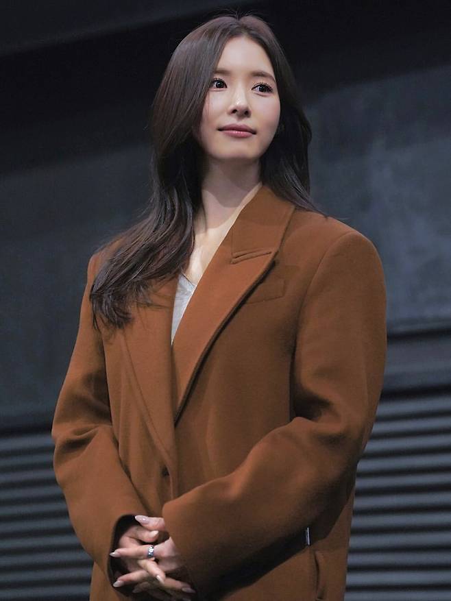 브라운 컬러의 테일러드 코트를 입고 단정하면서도 지적인 분위기를 자아냈다. 이너로는 깔끔한 톱을 매치하여 얼굴 톤을 화사하게 밝혔으며, 굵은 웨이브가 들어간 긴 머리를 자연스럽게 늘어뜨려 페미닌한 무드를 더했다. 과하지 않은 핏의 코트는 클래식한 멋을 주며, 전체적으로 부드러운 브라운 계열의 톤 온 톤 매치가 돋보이는 성숙한 스타일링이다.