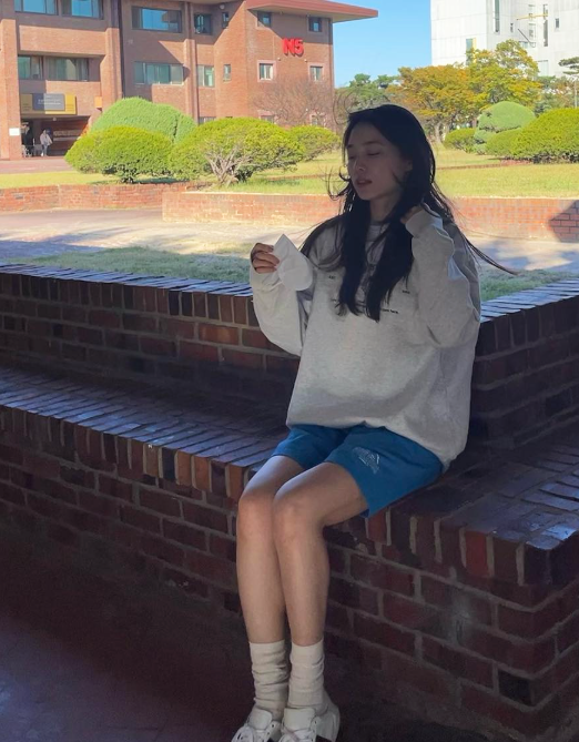 한적한 캠퍼스 공간에서 포착된 윤소희는 박시한 그레이 맨투맨 티셔츠에 블루 컬러의 무릎 길이 팬츠를 매치한 캐주얼 룩을 선보였다.