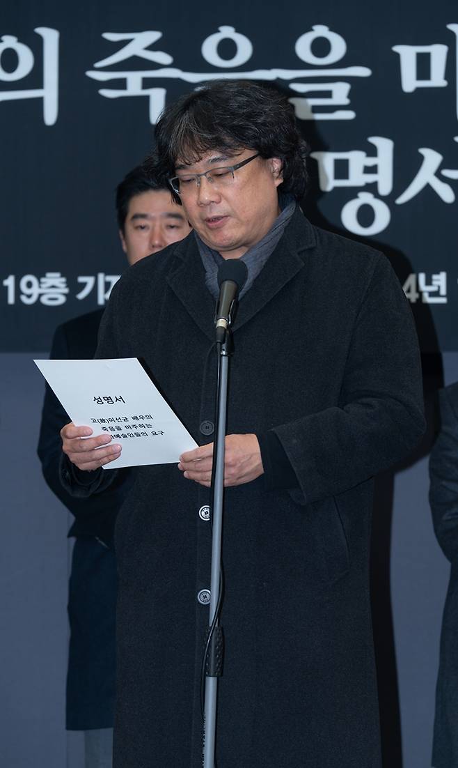 배우 이선균이 마약 투약 혐의로 경찰 수사를 받다 세상을 떠난 가운데 봉준호 감독, 배우 김의성, 가수 윤종신 등 동료 연예인들과 국내 대중문화계 주요 단체가 그의 안타까운 죽음을 애도하며 한목소리를 냈습니다. 문화예술인 연대회의는 12일 '고 이선균 배우의 죽음을 마주하는 문화예술인들의 요구'라는 제목의 성명을 발표했어요. 이들은 이선균 사건과 관련해 철저한 진상 규명과 재발 방지 대책을 촉구했는데요. 이번 사건을 계기로 이선균 방지법을 제정하려는 뜻도 공개했습니다. 현장에는 무려 300여명의 취재진이 성명 발표를 취재하기 위해 모였는데요. 성명서 발표 현장에서는 과연 어떤 말들이 오고 갔는지 바로 확인 가능합니다.
