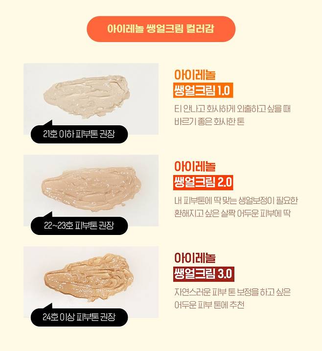 아이레놀 쌩얼크림은 3가지 톤으로
