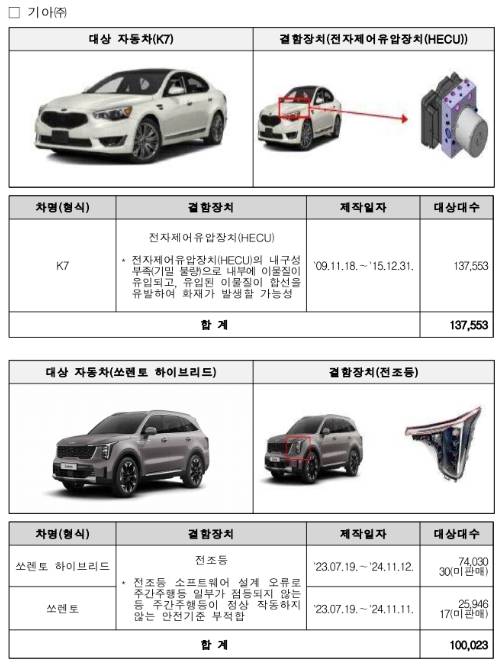 기아 K7 13만7553대는 전자제어유압장치(HECU) 내구성 부족으로 화재 가능성이 발견돼 전날부터 시정 조치에 들어갔다.