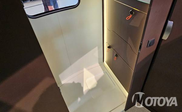 샤워실은 성인 한 사람이 사용할 수 있을 정도로 넉넉하다. 그 비밀은 변기가 이동식이기 때문이다. 변기를 별도의 보관함에 보관할 수 있어 상대적으로 샤워실이 넓고 쾌적하다. 세면대도 접이식 방식을 적용해 이동식 변기 보관함과 함께 공간을 넓게 사용할 수 있게 하는 요인으로 작용한다.