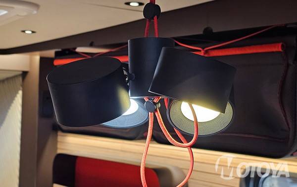 거실 공간 천정에는 조명이 설치되어 있다. 조명 시설도 독립적으로 사용할 수 있는 독립 모듈 4개로 구성되어 있다. 탈착식으로 원하는 장소에 조명을 떼어서 붙여 사용할 수 있다.