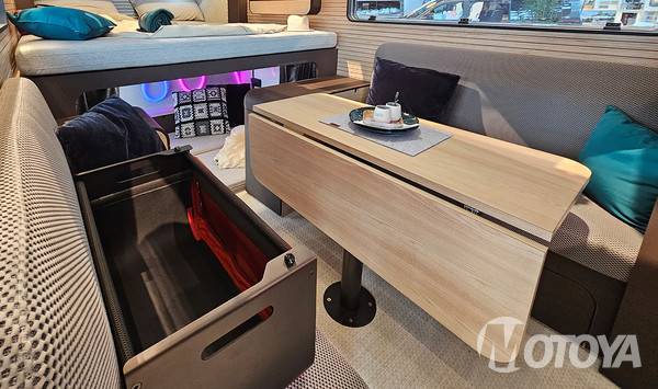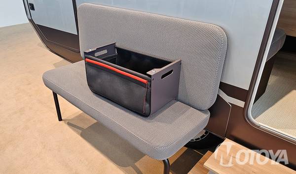 벤치형 소파도 주방의 싱크대와 마찬가지로 외부에서 사용할 수 있다. 테이블도 넓게 사용할 수 있는 큰 크기를 가지고 있다. 상부에는 탈착식 캐비닛이 자리한다. 캐비닛도 외부에서 캠핑박스로 사용할 수 있다.