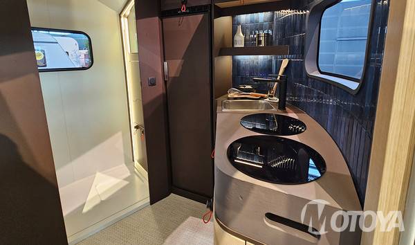 또한, 가장 큰 특징은 내부의 편의시설을 외부에서 사용할 수 있는 유연함을 적용했다는 것이다. 가장 먼저 내부의 화기로 제공되는 인덕션 2개가 설치된 주방의 일부를 카라반의 벽 면에 부착할 수 있다. 따라서 별도의 화기없이 외부에서 주방을 만들 수 있다.