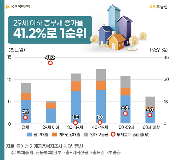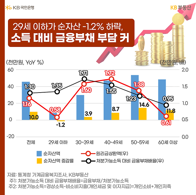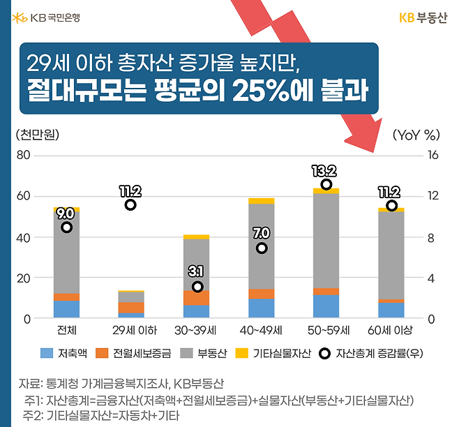 29세 이하의 저축액은 -7.4% 감소한 2,313만원, 전월세보증금과 부동산은 각각 18.0%, 13.8% 증가한 5,414만원, 5,089만원입니다. 평균 대비 저축액은 27%, 전월세보증금은 151%, 부동산은 13% 수준입니다. 전월세보증금 마련으로 인해 저축은 줄고, 부동산 구입도 충분치 않았습니다.