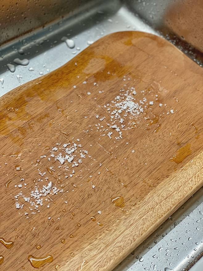 요리하면서 난 칼집들 위에 굵은 소금을 뿌려서 고무장갑을 끼고 박박 문질러준 후에 찬물로 헹궈주세요. 구연산 두 스푼 정도 희석한 물에다가 세척해도 좋아요.