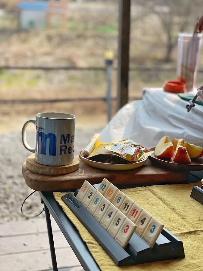 지난 봄, 포천으로 캠핑을 갔을 때인데 플레이팅 도마 하나 들고가서 유용히 썼어요.