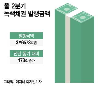 23일 한국거래소 등에 따르면 올 들어 ESG채권 가운데 녹색채권 상장금액은 5조2273억원으로 전년동기 대비 18.8% 증가했다. 특히 지난 2분기 상장금액이 3조6573억원으로 전년동기 대비 173%나 급증했다. 전체 ESG채권 가운데 사회적 채권 비중이 높지만 성장률로 보면 녹색채권이 두드러진다.