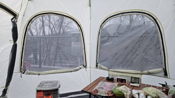 호수를 바라볼 수 있게 창문에 TPU 비닐도 달아주고 따뜻한 잠자리를 위해 전기장판을 깔고 위에 침낭도 올려놓았습니다.