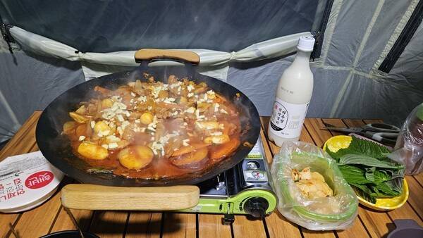 사용하는 난로가 열량이 높지 않아 온도가 아주 높게 올라가지는 않지만 춥지는 않을 정도는 됩니다. 저녁을 준비하고 파주 지역 막걸리에 저녁 식사를 했습니다. 캠핑할 때는 항상 그 지역 막걸리를 구매해서 저녁 식사 때 함께하는 편입니다. 전국 지역 막걸리와 함께하는 게 캠핑의 소소한 행복 중 하나입니다.