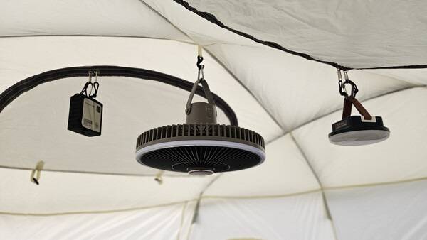 호수 뷰가 가능한 5번 사이트에 텐트를 설치하고 동계 캠핑에 필요한 것들을 세팅했습니다. 추운 겨울 난방이 필요한 동계에는 난로를 피우기 때문에 난방과 안전을 위해 준비해야 할 것들이 많습니다. 난로를 준비하고 따뜻한 공기를 내려줄 서큘레이터도 달아주고, 안전을 위한 일산화탄소 경보기도 함께 달아주었습니다.