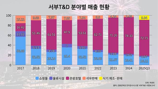 서부T&D는 최근 사업 포트폴리오를 호텔 중심으로 재편하고 있다. 2020년 매출의 절반을 차지했던 관광호텔업 매출은 올해 3분기에 72.75%(약 1220억원)로 크게 증가했다. 이와 함께 매출 비중이 꾸준히 줄어든 석유판매업은 올해 3분기 영업을 중단했다.