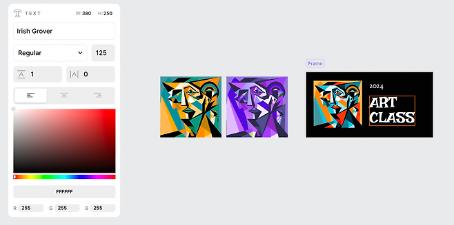 프롬프트를 통해 피카소풍의 초상화를 만들어보았어요. 생성된 이미지를 선택하고 Recraft 하면, 기존 이미지를 자동으로 학습해 다음 결과물을 만들어주고, 아예 새로운 프롬프트로 캔버스 내에 여러 개의 이미지를 만들 수도 있어요.