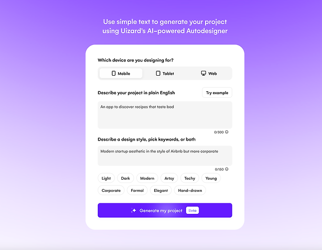 디바이스를 선택하고, 영문 기준 프로젝트와 디자인 스타일 등에 대한 두 가지 내용을 입력할 수 있어요. 저는 일단 어떤 결과를 보여줄까 궁금해서 샘플로 제공되는 내용을 활용했어요.