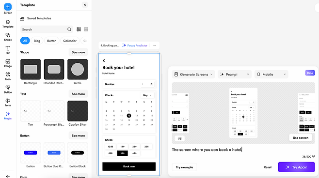 앞서 살펴본 기능은 원하는 스타일과 컨셉에 맞는 화면 전체를 생성하는 방법이고, 생성 후 아직 포함되지 않은 새로운 화면을 개별적으로 생성하는 것도 가능해요. 이 때 역시 텍스트를 입력해(호텔을 예약할 수 있는 화면 등) 특정 화면 5개를 생성할 수 있으며 하나를 선택해 편집 화면에 넣을 수 있어요. ‘uizard’를 잘 쓴다면, 텍스트 입력마으로 필요한 모든 화면의 초기 버전을 빠른 시간 내 만들 수 있겠죠? (다만, 무료 버전은 프로젝트 개수 2개, 프로젝트별 작업 가능한 화면이 5개로 제한)