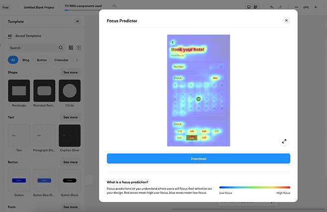 ‘uizard’ 역시 스크린샷, 스케치 등으로 화면 제작 등 다양한 기능을 제공하지만, 제 마음을 사로잡은 기능은 바로 시선 추적 예상 데이터에요. 텍스트로 만든 화면은 물론, 편집 화면에서 작업 중인 모든 화면 단위로 시선이 어떻게 머무르고 움직이게 되는지에 대한 예상 데이터를 확인할 수 있어요. 동일한 목적의 여러 화면을 텍스트로 만들고 예상 데이터를 활용해 최종 시안을 추리는 것도 가능하겠네요.