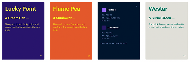 알고리즘 기반으로 크로마가 추천해 준 컬러 조합 중 일부를 가져와봤어요. 조합별로 색상 이름, 16진수, RGB 값, CSS 코드 및 WCAG 접근성 등급도 확인할 수 있습니다. 기본적으로 텍스트와 배경의 조합으로 컬러 매치를 보여주고 있는데, 이외에도 Poster, Gradient 등으로도 확인할 수 있어요.