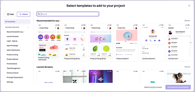 와이어프레임과 프로토타입을 제작하는데 최적화된 툴이기에 AI를 활용한 화면 제작과 별개로 편의를 더해주는 기능도 다양하게 제공하는데요. 1,500여개가 넘는 템플릿이 등록되어 있어 특정 카테고리의 화면을 불러와 바로 작업을 시작할 수 있으며, 다양한 구성요소와 아이콘을 제공해 별도의 플러그인 등을 활용하지 않고도 편집을 쉽게 할 수 있도록 도와줘요.