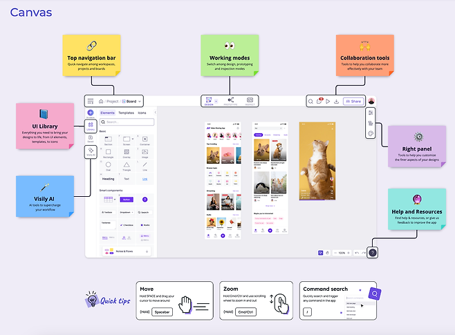 곧, 텍스트(명령어)를 바탕으로 화면을 제작할 수 있는 기능과 화면 등에 입력된 텍스트를 보정해주는 기능이 추가될 예정이라고 해요. ’Visily는 현재 누구나 무료로 사용할 수 있으며, 기능 제한이 없어 더 자유롭게 활용이 가능해요.