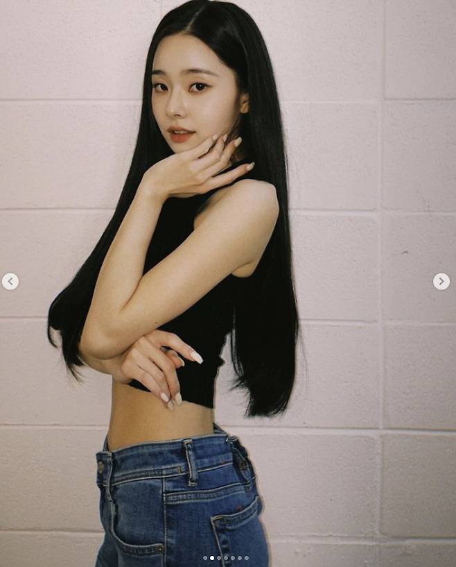 24일 프리지아는 아무 설명없이 헤어 메이크업을 받는 모습과 민소매 크롭티에 청바지 차림으로 한줌 허리가 강조된 모습을 공개했다.