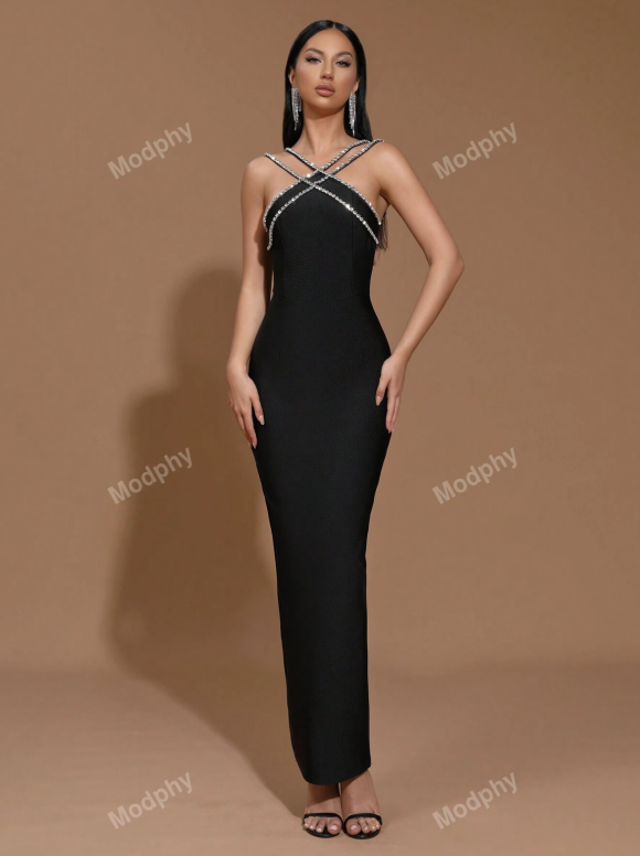 Modphy의 "헤비 체인 크리스탈 다이아몬드 밴디지 바디콘 롱 드레스"는 그 자체만으로도 충분히 화려한 아이템이다.
