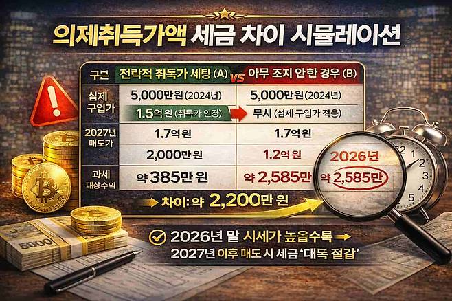 구분의제취득 적용미적용실제 구입가5,000만 원5,000만 원2026년 말 시세1.5억 원미반영2027년 매도가1.7억 원1.7억 원과세 대상 수익2,000만 원1.2억 원예상 세금(22%)약 385만 원약 2,585만 원