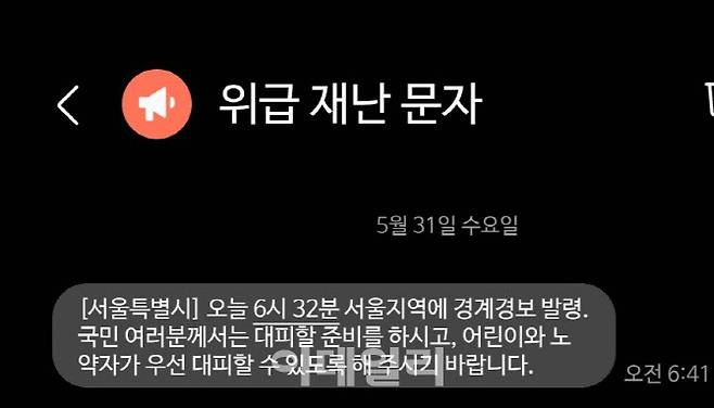 [이데일리 양희동 기자] 북한이 31일 오전 서해 방향으로 군 정찰위성을 발사하면서 서울시가 이날 오전 6시 41분 경계경보를 발령한다는 위급재난문자를 발송했지만, 행정안전부는 오발령 사항이라고 밝혔다. 이에 서울시와 행안부는 경계경보가 오발령 된 경위에 대해 파악하고 있다.