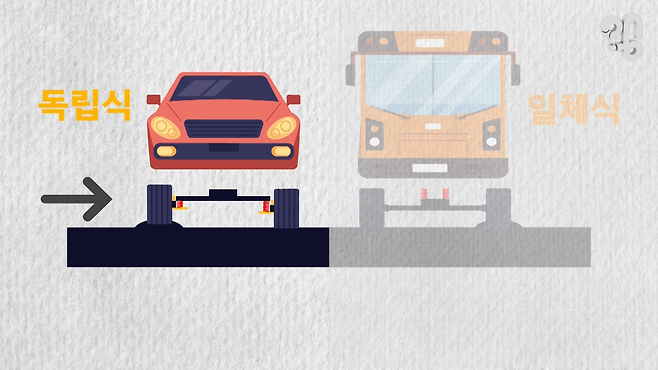 일반 승용차에서 쓰는 장치는 ‘독립식’.자동차의 좌우 바퀴가 따로 움직여서 충격을 따로 흡수하기 때문에 차체가 충격을 받을 때 여러 방향으로 부드럽게 움직이고, 소음도 적은 편이다. 아무래도 탄 사람이 흔들리지 않는 편안함을 느끼는 걸 우선순위로 삼았다고 할 수 있다.