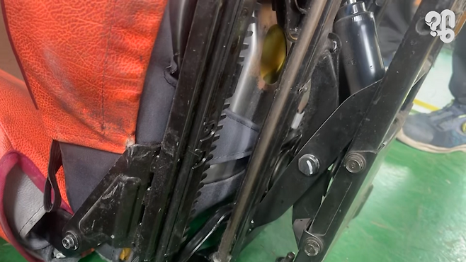 전문업체를 찾아 직접 각각의 시트 구조를 들여다봤다. 일반 좌석을 보면 이렇게 아래에 별다른 충격 완화 장치가 없는데, 서스팬션 시트는 이렇게 X자로 된 구조 덕에 위아래로 움직이는 장치가 있다. 그리고 내부를 더 들여다보면 안쪽에 금속 스프링이 들어있는데, ‘에어 서스펜션’은 이걸 공기를 주입한 ‘에어 스프링’으로 바꾼 거다. 실제로 착석을 해봤더니 등이 녹아내릴 정도로 편안한 느낌이었다.