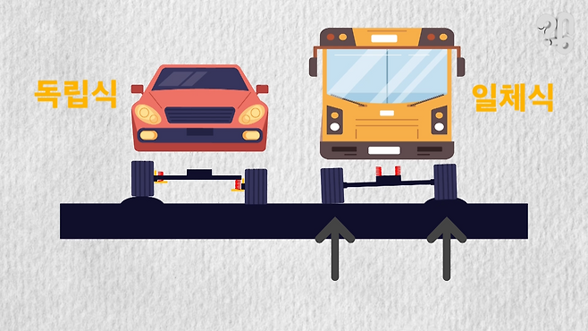 자동차공학과 교수님에게도 물었더니 대형차량에 일체식을 써야하는 또다른 이유를 알려줬다. 대형차량은 승용차처럼 서스펜션을 설치하면 차체가 승용차보다 훨씬 무겁기 때문에 양끝이 위아래로 움직이는 폭도 훨씬 클 것이고, 또 차체 자체가 길기 때문에 앞뒤나 옆 기울기가 조금만 심해져도 차체가 도로에 닿거나 긁혀버릴 가능성이 있다는 거다.