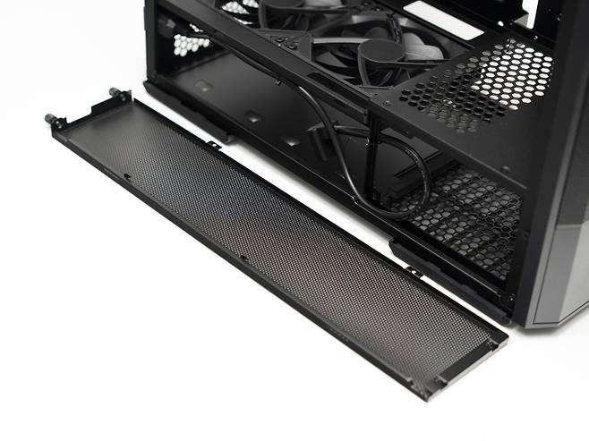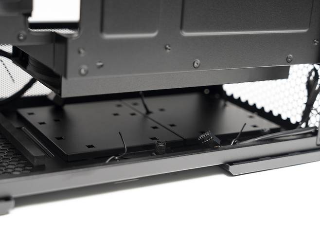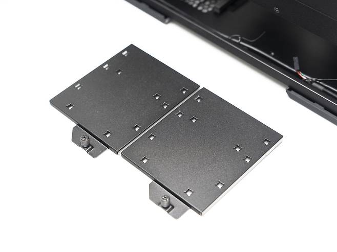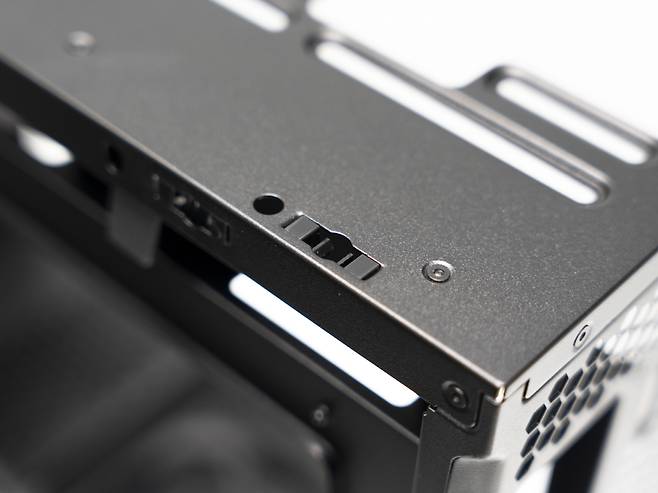 하단부에는 SSD와 HDD를 위한 전용 브래킷이 장착되어 있습니다. 이를 통해 최대 2개의 저장 장치를 설치할 수 있으며, 필요에 따라 SSD와 HDD를 조합해 사용할 수 있습니다.