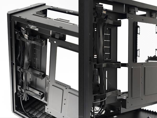 앞서 말씀드렸듯 독특한 파워서플라이 설치 방법이나 내부 공간 설계 덕분에 콤팩트한 미들타워임에도 케이블 정리가 상당히 용이한데요 일반 파워서플라이뿐만 아니라 리안리 LI Edge PSU를 사용하면 좀 더 깔끔한 선 정리를 할 수 있습니다.