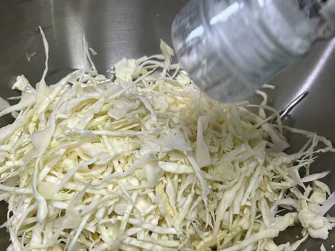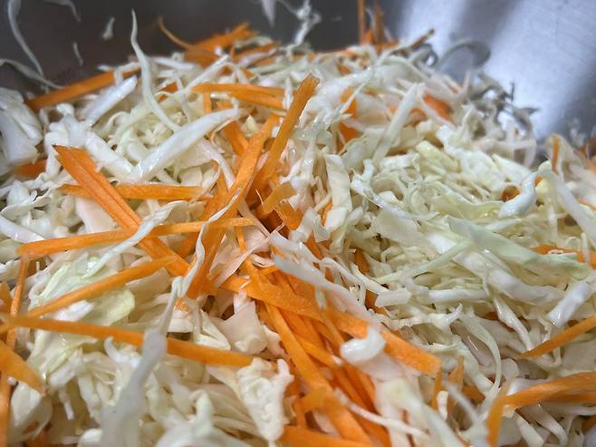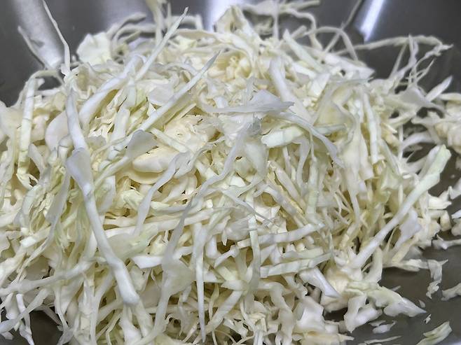양배추는 최대한 얇게 채를 썰어서 준비합니다. 양배추는 두꺼우면 질기고 먹기 힘들기 때문에 가늘게 써는 것이 중요합니다.