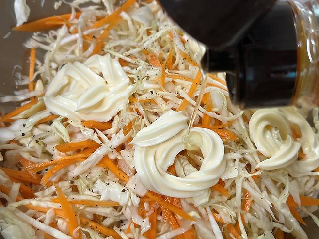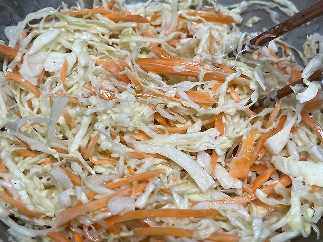 소스와 양배추가 잘 섞이도록 골고루 무쳐 주세요. 양배추 샐러드 무칠 때는 손으로 하지 마시고 젓가락이나 집게 등으로 해 주세요. 손으로 힘주어 무치면 오히려 양배추가 다 부서질 수 있습니다.